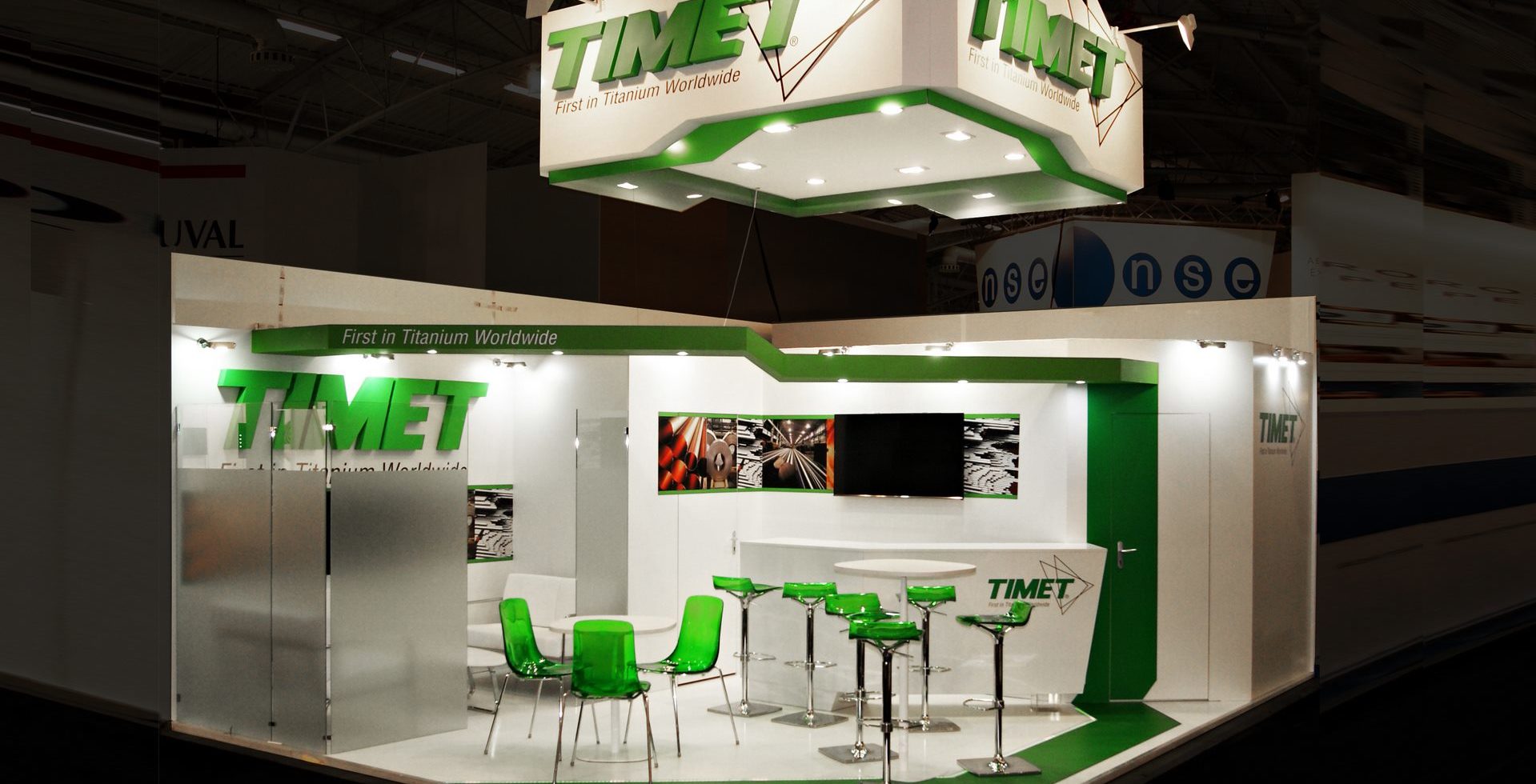 Conception et agencement du stand de 32 m2 sur plancher au salon de l’aéronautique du Bourget. Stand équipé d’une enseigne élinguée avec lettrage en volume.